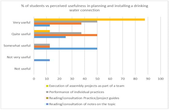 Considering the limitations of the study—given that in each year’s group the characteristics of students on the intermediate vocational training course in water treatment networks and treatment plants are very diverse in terms of age, prior knowledge, educational background, and personal circumstances—no generalisations are intended to be made based on this case. However, the present study sets a starting point for identifying trends in the perception of usefulness of different didactic means among students as a factor to consider in the planning of the course. Hence, this study will be continued in subsequent years with successive cohorts of students and will consider additional groups from other educational centres. In doing so, the knowledge derived from this present study and subsequent studies may be relevant for the redesign of the intervention associated with the network assembly and commissioning module and facilitate learning across different student profiles.