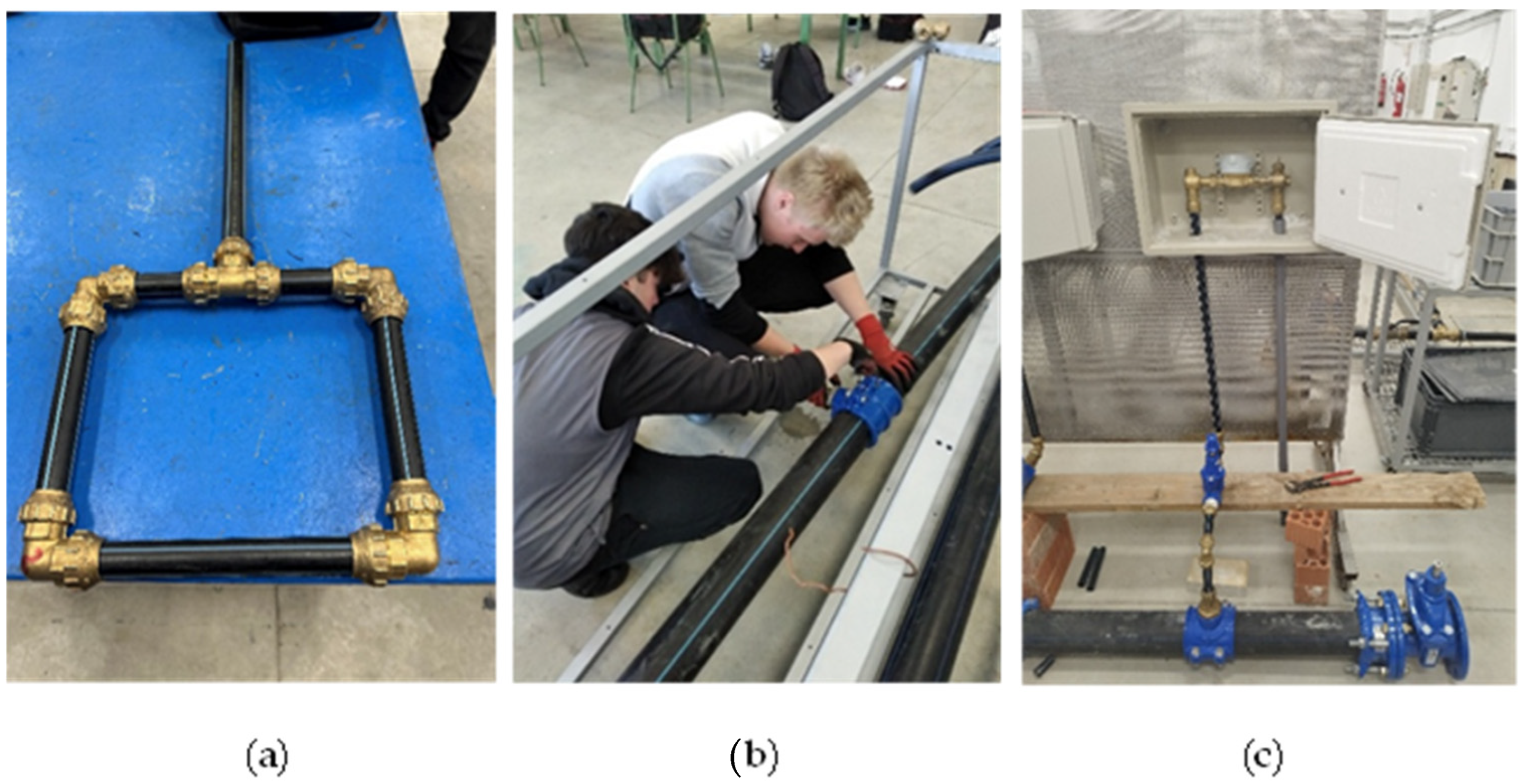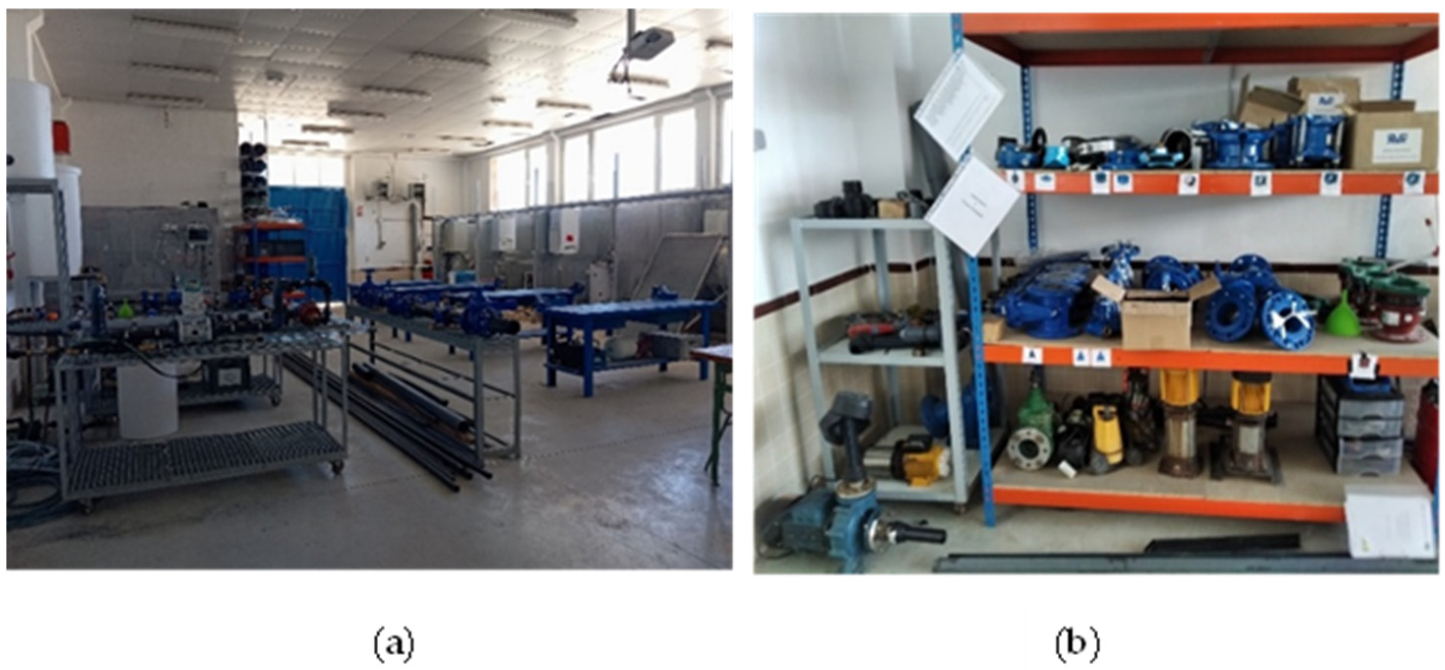 - Workshop on installing systems using all types of tools, components (valves, metres, pumps, etc.), and accessories (flanges, joints, fittings, etc.) for individual assembly, involving different basic work procedures, and the manufacture of a product (individual practical work). An overview of the workshop and some of the equipment and accessories can be seen in Figure 1. Figure 2 shows examples of this type of task.