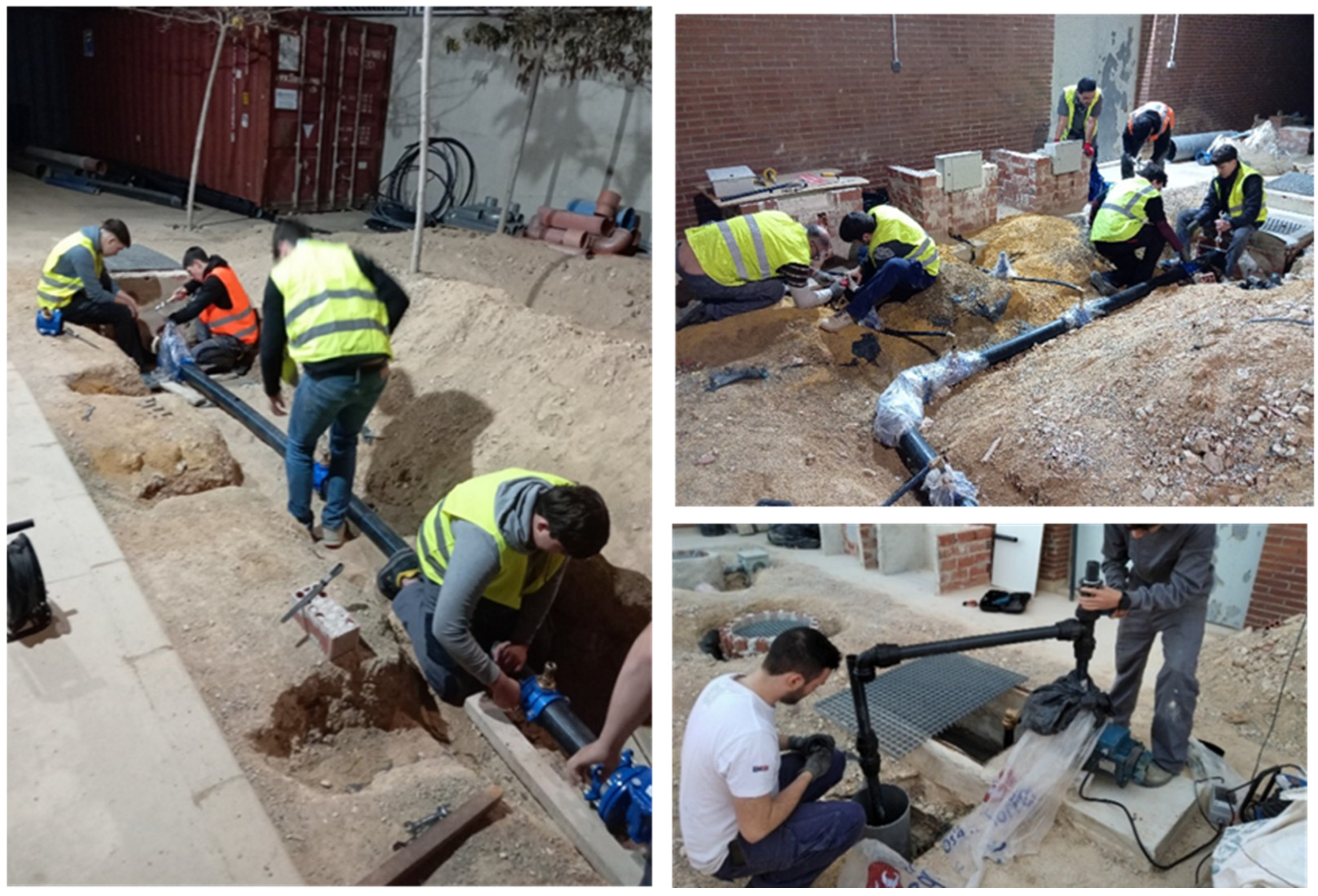 - Workshop for assembling installations with all types of tools, components (valves, metres, pumps, etc.), and accessories (flanges, joints, fittings, etc.) for the development of complex installations, including water networks, which require coordination and teamwork to complete (collaborative projects). Figure 3 shows the work area for the development of collaborative projects inspired by real jobs, while Figure 4 shows students working on this type of project.