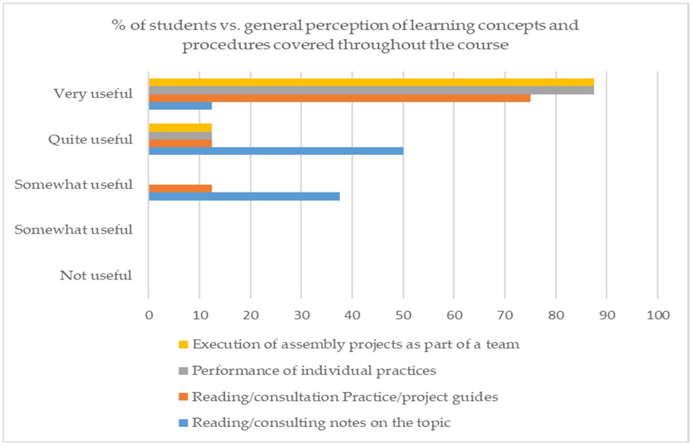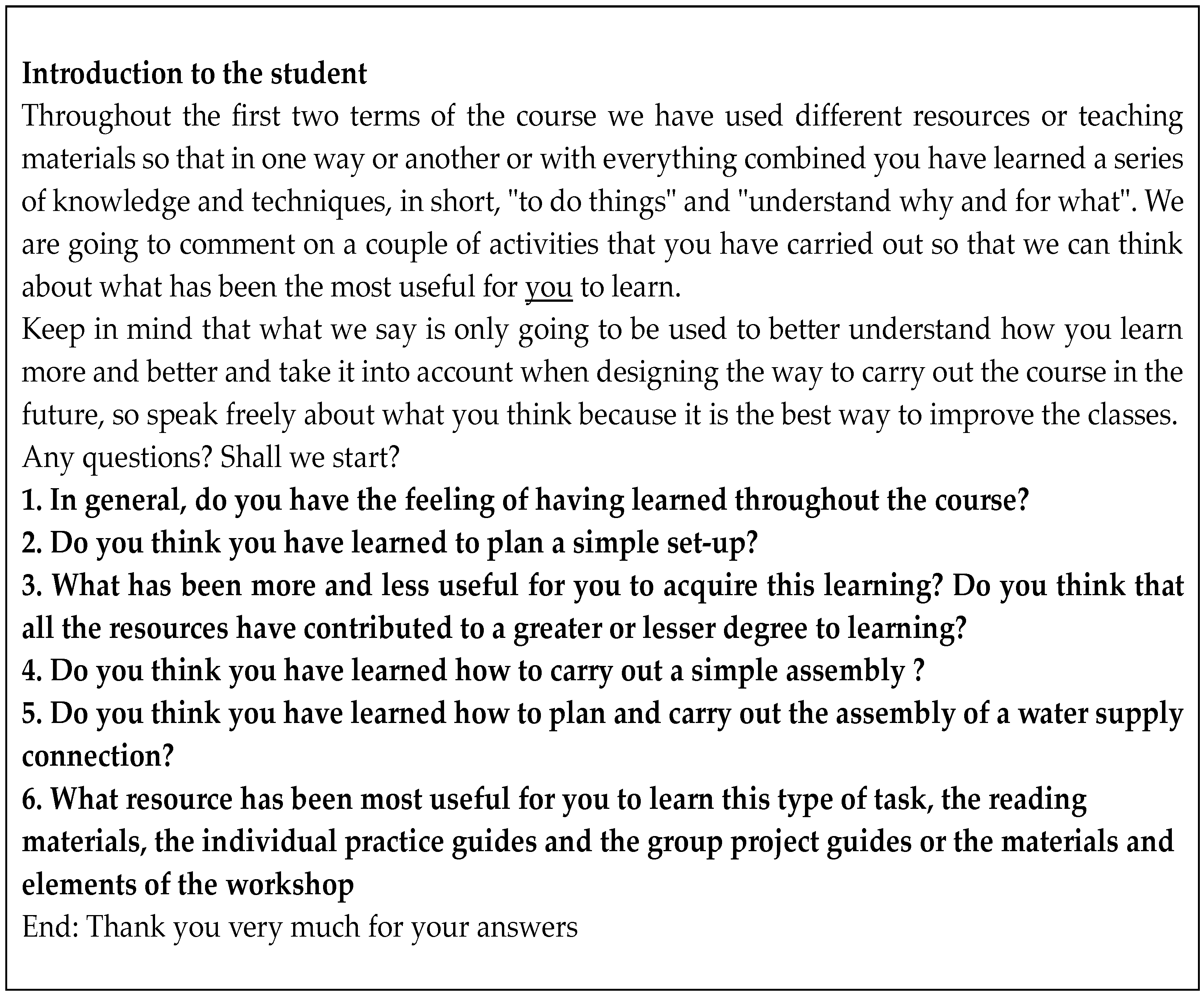 | C4 | Resource/method with the greater utility attribution. | Resource/method that was perceived by a learner as the most useful type for the acquisition of skills. | “The work outside (referred to external workshop) is how it stays the most” (S1Q6R6). “Trench mounting is the most complete” (S2Q6R6) “Group projects first” (S4Q3R3) “Yes, especially the practical part” (S5Q1R1) “The most useful when you do it alone” (S5Q3R3). “much more with practice than with theory” (S7Q1R1) “The first thing is the practice that I have done alone” (S7Q3R3) “In practice is where you learn” (S8Q6R6) |