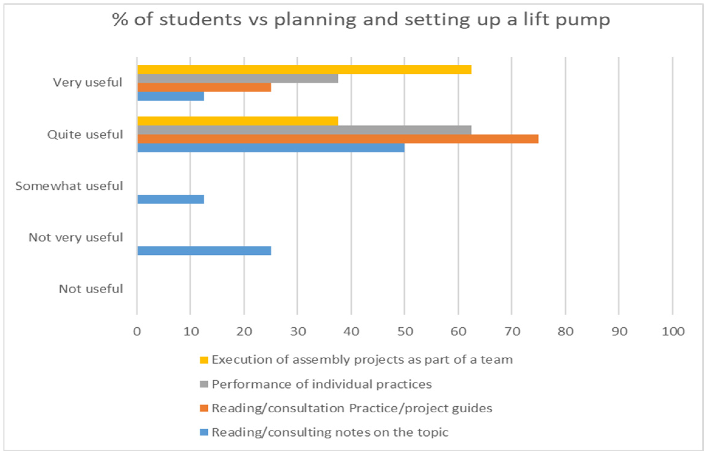 | 3. Planning and assembling a pump to drive water from one tank to another higher tank requires a variety of knowledge and the application of several techniques seen throughout the course. To what extent have been the different learning methods used useful to you? | ||||||