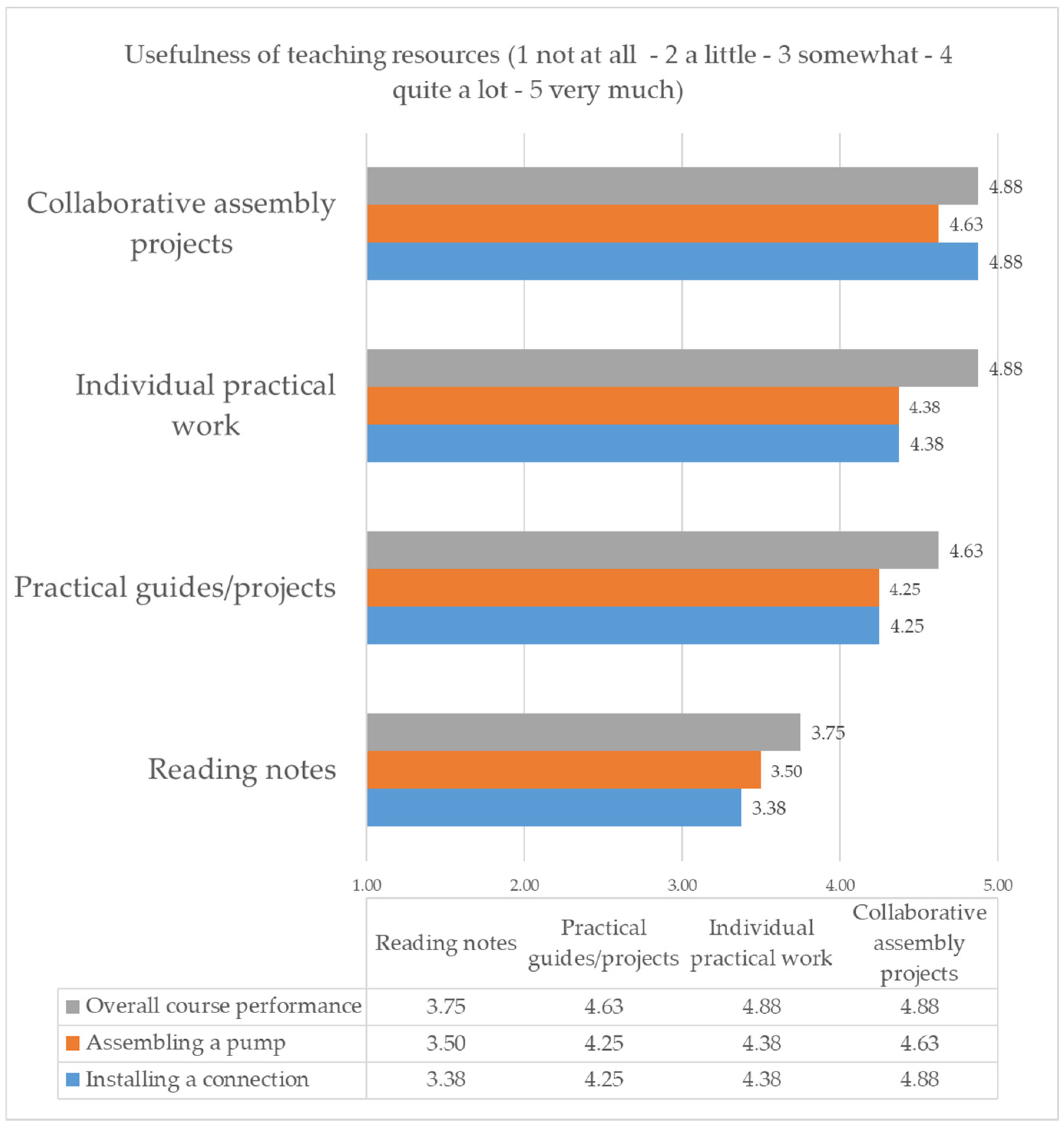 Student 2: “Everything, yes. There are things in the notes that I didn’t know, for example, about water hammer. I didn’t know the symbols, and I learned them with the theory”. When asked about the order of usefulness, Student 2 added: “Individual practical work first and then group assembly because some people don’t help. The notes and guides are helpful, but less so”.