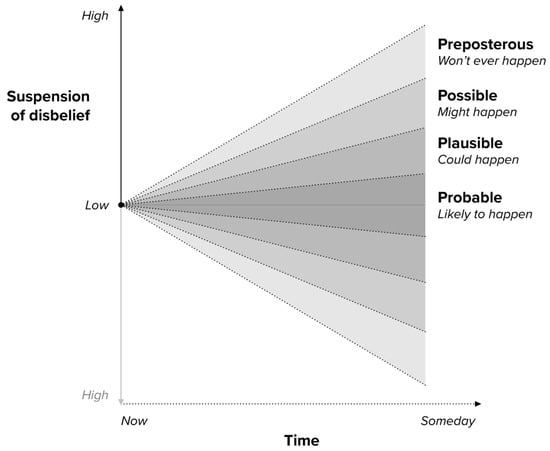 Preposterous alternatives stand in contrast to those within the ‘probable, plausible, and possible’ spaces, which represent what is ‘likely to,’ ‘could,’ or ‘might’ happen, respectively [31]. We see these traditional future categories—particularly the ‘probable’ and ‘plausible’—as reflective of evidence-based solutions due to their reliance on “current trends” and “our current understanding of how the world works”[31]. Kinch et al. contend that exploring alternatives beyond these traditional future categories “challenges our conventional thinking and ignites curiosity” by leveraging their provocative and imaginative potential [13] (p. 6).