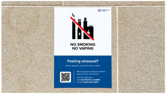 This image illustrates a speculative, probable intervention where no-smoking/no-vaping signage integrates stress-related messaging alongside cessation resources. The design pairs restriction with support, using a QR code to connect individuals to additional quitting assistance.