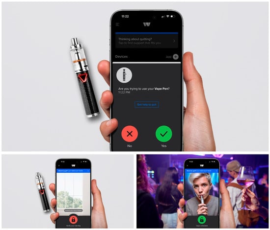 Top: This image illustrates the initial authentication prompt, where attempting to activate a vape device triggers a push notification on the user’s smartphone, requiring confirmation before proceeding. Bottom left: This image depicts the face verification step, where users must hold their phone up to their face for the duration of activation. Here, the vape remains locked as the user’s face is not in frame, emphasizing the added friction in the process. Bottom right: This image demonstrates the intervention’s disruptive effect in social settings, making vaping more conspicuous by requiring a visible authentication process, potentially deterring habitual use.