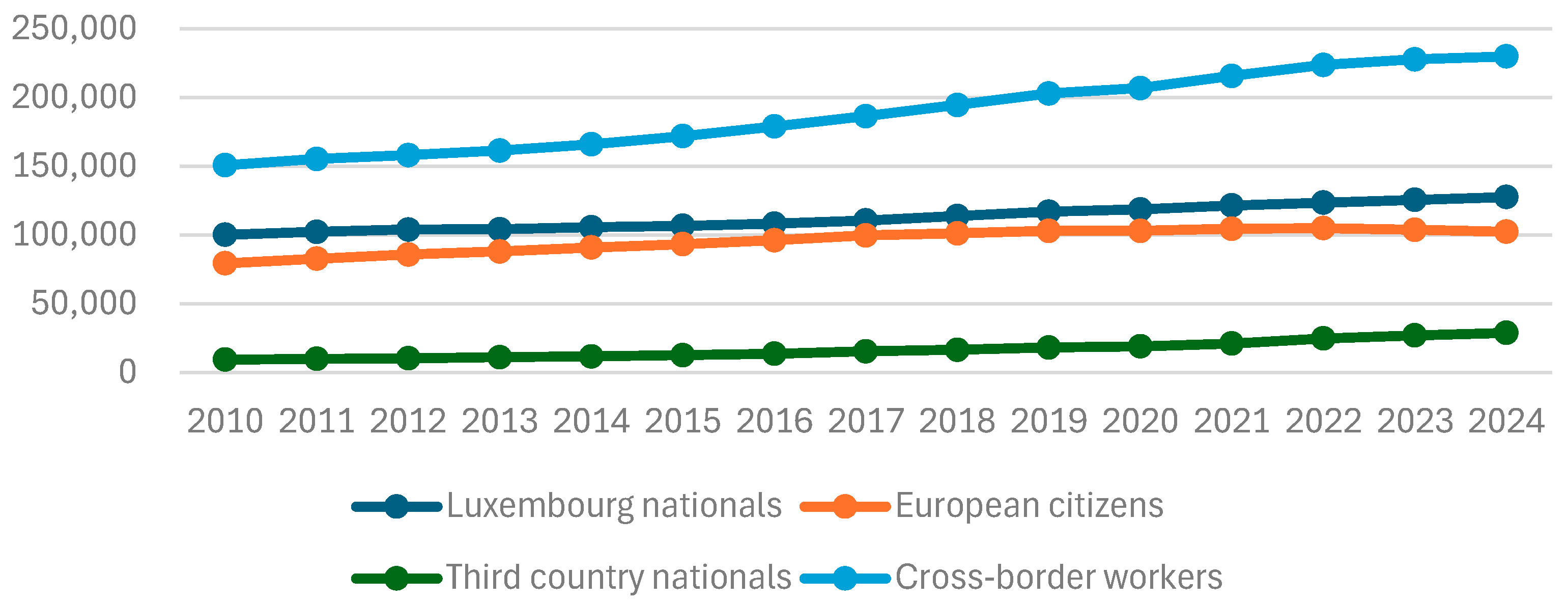 - The foreign population is composed of 101.070 EU Citizens and 29.561 Third-Country Nationals, while the Cross-Border Workers Coming from France Amount to 127.101; from Germany 51.690 and from Belgium 51.296. Statec, Emploi Salarié Intérieur Par Lieu de Résidence, Luxembourg, Q2 2025. Available online: https://lustat.statec.lu/vis?fs[0]=Th%C3%A8mes%2C1%7CPopulation%20et%20emploi%23B%23%7CMarch%C3%A9%20du%20travail%23B5%23&pg=0&fc=Th%C3%A8mes&bp=true&snb=46&lc=fr&df[ds]=ds-release&df[id]=DSD_EMPLOI_SAL%40DF_B3002&df[ag]=LU1&df[vs]=1.0&dq=..Q....&lom=LASTNOBSERVATIONS&lo=5&pd=2015-Q1%2C2025-Q2&to[TIME_PERIOD]=false (accessed on 27 November 2025).