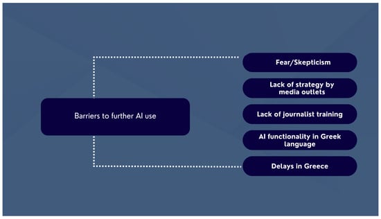 Participants identified several reasons for the limited use of AI in Greek journalism. As portrayed in Figure 2, they highlighted (a) a general delay in embracing or implementing new technologies within the Greek context due to cultural, economic, or structural factors that inhibit quick adaptation to emerging trends; (b) the fact that media owners in Greece lack a well-defined plan or strategy for incorporating AI into their operations and, as a result, AI tools are either less used or not integrated in a way that could maximize their potential benefits, such as automating tasks; (c) skepticism and fear on behalf of media professionals, often stemming from (d) inadequate knowledge and training in AI technologies; and (e) language constraints, as some AI tools are not well-suited for the Greek language due to limitations in natural language processing (NLP) models.