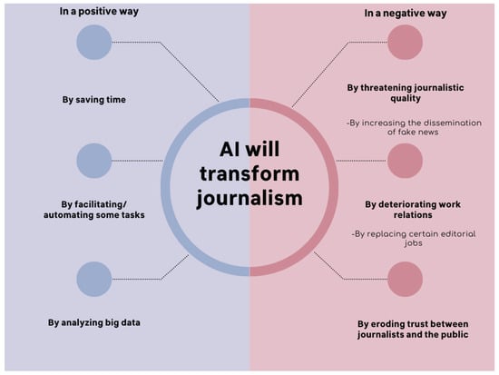 Among these transformations, its integration into journalism has sparked intense debates on its potential negative impacts on journalism, particularly in terms of content quality and ethical implications [2,3,4]. However, the use of AI in journalism also provides a range of benefits [3]. For example, AI can make journalists’ work more productive and efficient by relieving them from certain routine tasks [5]. That being said, overall, it is important to stress that the discussion on the impact of AI on journalism is part of a larger conversation on media digitization and the transition to a journalistic ecosystem that uses applications, algorithms, and social media in ways that transform traditional journalism [6,7]. In this context, AI technologies, no matter whether their influence is short-term or long-term, are part of a broader framework of technological change reshaping journalism [7].