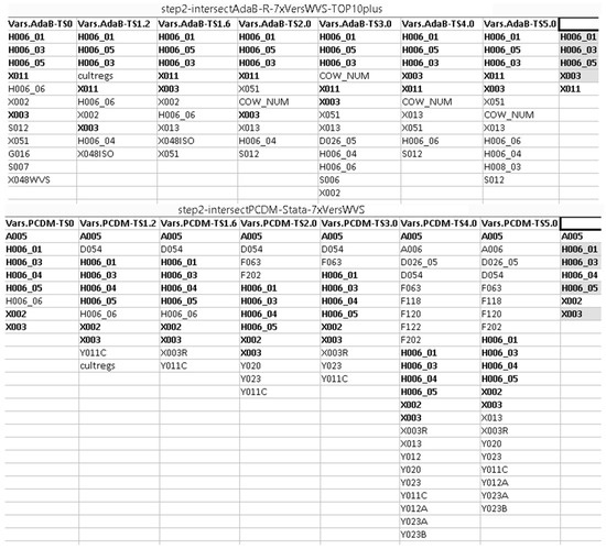 The same logic is applied when providing complete details for the second (https://tinyurl.com/mr3nus6d [accessed on 1 February 2025]—intersection and reunion of the specific results summarized in Figure 1, the last column of each of the three sets). The results in Figure 1 (the second round of selection) clearly show that only four variables stood across all three methods used in round 1 and all seven dataset versions. It is about an intersection subset of four: H006_01 (Worries: Losing my job or not finding a job), H006_03 (Worries: A war involving my country), H006_05 (Worries: A civil war), and X003 (Age). Additionally, these results point out specific variables of each method but are common to all dataset versions, namely a reunion subset of five: X011 (How many children do you have) for ADA BOOST (top of Figure 1), A005 (Important in life: Work), H006_04 (Worries: A terrorist attack), and X002 (Year of birth) for PCDM, and H006_06 (Worries: Government wiretapping or reading my mail or email) together with X011 (How many children do you have) for the last approach based on Gradient Boosting.