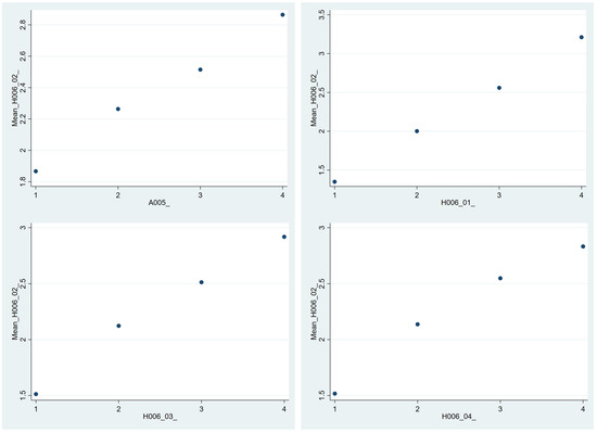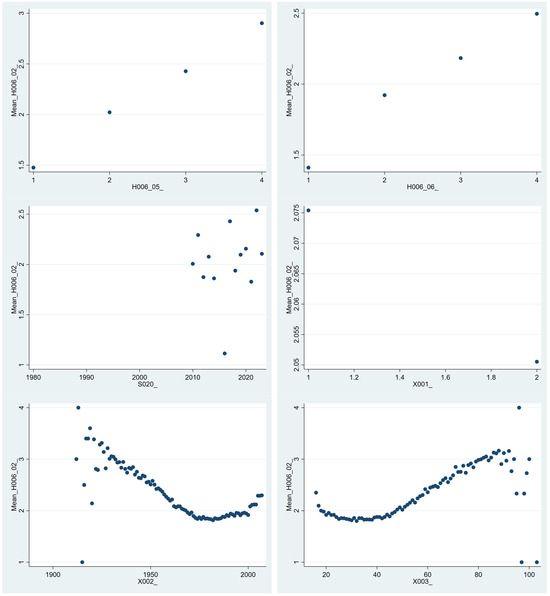 The two-way graphical representations between the target variable and each of the core variables in the triad (H006_01, H006_03, and X003 in Figure 4) together with those found after the first round of selections and the socio-demographic category (last ten in Figure 4), all based on tabulations by mean, were also included in this study. These visualizations (Figure 4) intuitively indicate how the target variable behaves (on average/at mean) when connected to all variables relevant to this analysis and the entire study.
