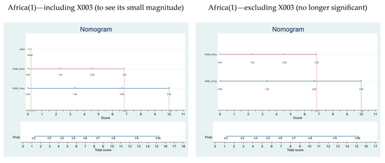 LASSO (both the CVLASSO with 10-fold cross-validations using randomly extracted subsets of data and RLASSO as a more rigorous form meant to eliminate overfitting and generate more robust models), VCPR, LOGIT, and NOMOLOG served as the next selection steps (3c) in this third round. The first did not eliminate anything (neither CVLASSO nor RLASSO). The second (VCPR) identified collinearity based on OLS regressions between four pairs ((H006_03, H006_05), (H006_03, H006_06), (H006_05, H006_06), and (X003, X011)—online at https://tinyurl.com/yz8s9cfu [accessed on 1 February 2025], page 64 of 69, command line no. 26) when considering the target variable in its binary format, and between just two pairs from those four above ((H006_03, H006_05) and (X003, X011)—online at https://tinyurl.com/yz8s9cfu [accessed on 1 February 2025], page 63 of 69, command line no. 25) when considering the target in its original form (scale). NOMOLOG based on LOGIT regressions (Figure 2) further suggested in an intermediary nomogram based on six redundant predictors (Figure 2) the elimination of the weakest among those involved in collinear pairs, namely the following: H006_05 (lower overall magnitude and consequently weaker than H006_03), H006_06 (weaker than both H006_03 and H006_05), and X011 (weaker than X003). That means that previously used methods (including PCDM, Adaptive and Gradient Boosting, BMA, reverse causality checks, as well as CVLASSO and RLASSO) are less sensitive in terms of removing all redundancies (compared to VCPR, which identifies all collinear pairs, depending on the target variable). Moreover, the order of some specific steps (e.g., the causality tests before the elimination of redundancies based on multicollinearity criteria) seems to be of extreme importance to avoid selection errors such as keeping only apparently more important variables (higher magnitude in nomograms) but without the role of predictors (simple associations).