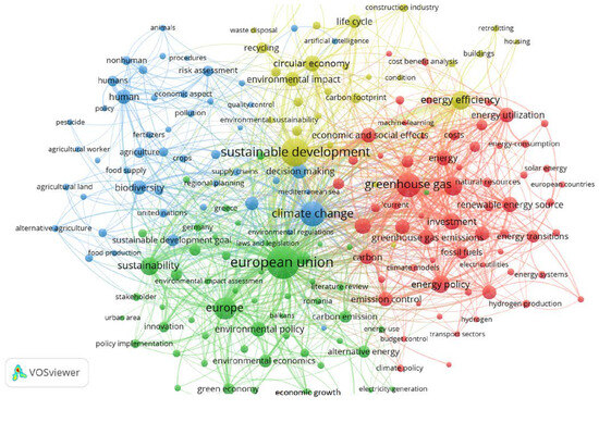 Keywords and main thematic clusters appearing in Scopus. The lines represent individual connections within the elements. Policy-oriented cluster (1)—Green. Climate change, biodiversity and agriculture cluster (2)—Blue. Sustainability, circular economy, and building cluster (3)—Yellow. Energy, emission, and air pollution cluster (4)—Red. Source: based on authors data collection visualizing in VOSviewer.