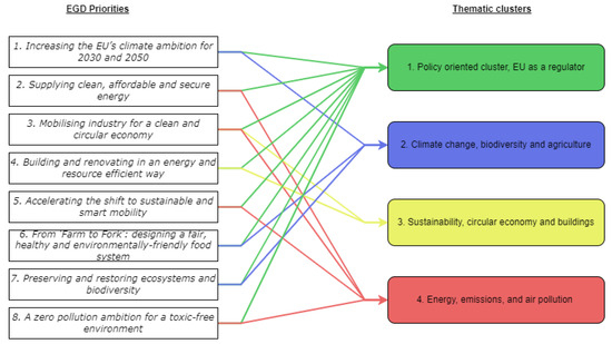 The connection of the EGD priorities and the thematic clusters of the EGD discourse. The arrows represent the connection between the EGD topics and the most relevant topic clusters in WoS and Scopus. Source: based on authors’ data collection.