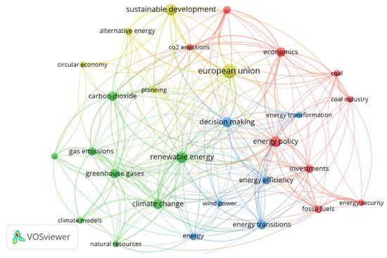 Keywords and main themes appearing in Scopus for the CEE region. The lines represent individual connections within the elements. Policy-oriented cluster (1)—Yellow. Climate greenhouse emission cluster (2)—Green. Energy and energy transformation cluster (3)—Blue. Harmonizing EGD policies and the transition of fossile regions cluster (4)—Red. Source: based on authors’ data collection visualized in VOSviewer.