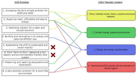 The connection of the EGD priorities and the CEE region thematic clusters of the EGD discourse. The arrows represent the connection between the EGD topics and the most relevant topic clusters in WoS and Scopus. Source: based on authors’ data collection.