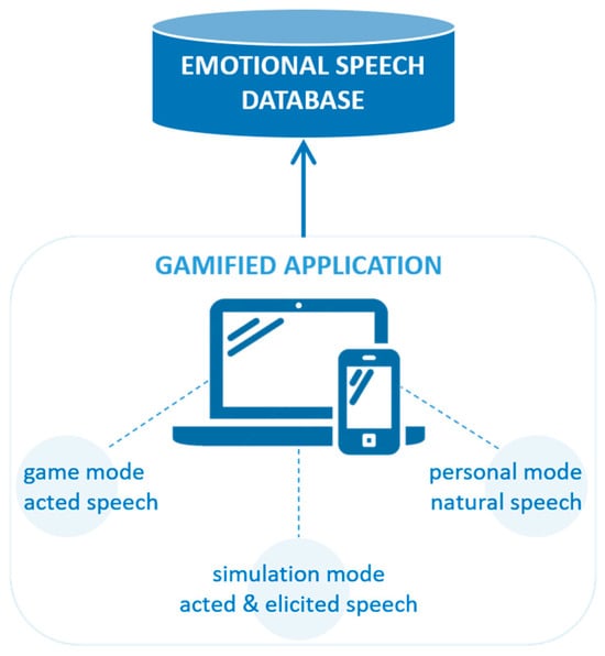 The design of the gamified application was based on two main pillars, reflecting its dual focus. The initial objective was to utilize the tool to enhance SER systems. Consequently, the specification was established to combine and integrate three distinct methodologies for database creation and enhancement. Specifically, the three categories, which are distinguished according to the manner and quality of data collection, are as follows: natural, acted (simulated), and elicited (induced). The natural category involves gathering unprompted and genuine samples of emotional speech captured in authentic contexts and situations. The acted category pertains to the recording of emotional speech data through the professional contribution of actors and artists, aiming for maximum consistency of emotion in active speech. The elicited category involves creating simulated situations to evoke and stimulate specific emotions in a more natural manner [59,60]. Accordingly, the objective of the application’s design axis was to identify a methodology for combining these three categories of data collection (Figure 2) to optimize the performance of the SER system.
