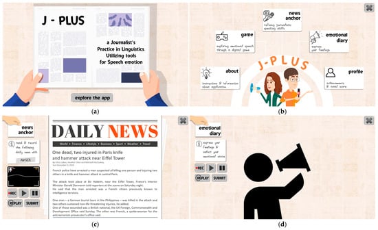 This figure presents the original user interfaces (a,b) and the modules designated as the “news anchor” and “emotional diary” ((c) and (d), respectively). The presented high-fidelity prototypes represent the initial version of the gamified application.