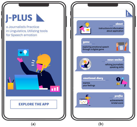 The main “J-Plus” interfaces: (a) Start screen; (b) Main menu screen (about; game; news anchor; emotional diary; profile).