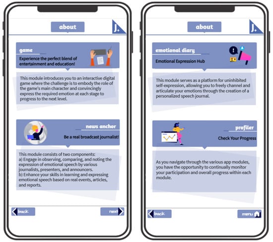 In light of this parameter, the specifications and design of the second objective were duly modified. The concept of combining three distinct categories of emotional speech data led to the design of a gamified application comprising three discrete modules. The objective of these modules is to facilitate a novel approach to the acquisition of emotional speech. As this is a digital training tool with elements of interaction and play, the discrete design of three modules/methods was emphasized. The aim was to provide users with the flexibility to choose their preferred method for training in emotional speech. Furthermore, beyond merely offering training methods, the integration of these three distinct methods facilitates the identification of user preferences. This enables the determination of which method is most attractive and preferred by users, thereby enhancing its effectiveness. Additionally, this focus allows for further enhancement and exploitation of the preferred method. As shown in Figure 2, the first module involves the design of a serious game. Users are immersed in a digital world, identifying with the central character to complete various challenges and achieve specific goals. This module aims to engage users in informal educational activities that provide enjoyable practice in emotional speech while simultaneously collecting qualitative data according to the acted speech methodology. The second module is designed to simulate activities tailored to the needs of journalism professionals in oral presentation and information expression. Users interact with existing journalistic articles, documents, and news programs, either by presenting them to practice their emotional speech expression or by observing and evaluating them to identify errors and inconsistencies in the conveyed emotions. This module aims to teach and refine emotional speech skills based on real-world events, conditions, and situations, integrating and promoting both acted and elicited speech methodologies. The third module was designed to foster a sense of personal commitment between the user and the application, adhering to the natural speech data collection methodology. This module aims to dismantle barriers, rules, and inhibitions regarding emotional expression, allowing individuals to freely articulate their emotional states. This innovative approach culminated in the creation of an emotional diary. The subsequent phase of the project involved defining scenarios for each module, along with the objectives that the application is designed to achieve.