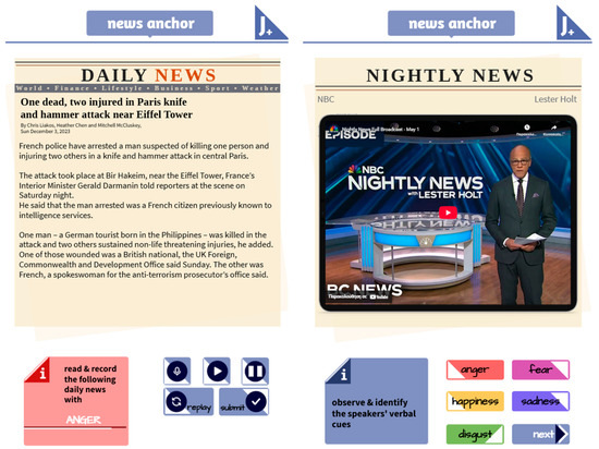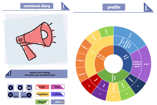 The “About” module provides users with information regarding the feasibility and potential uses of the application. The “Game” section features a serious game designed to engage users in enjoyable yet challenging tests. This game incorporates elements of competition, practice, and evaluation pertinent to the desired expression of specific emotions (game mode: acted speech). The “News Anchor” module focuses on training and improving emotional speech for individuals in journalism. This module offers two versions: (a) training in the delivery of emotional speech through the presentation of authentic news items and events (simulation mode—acted speech) and (b) observation and analysis of the emotional speech of professional speakers (simulation mode—elicited speech). The “Emotional Diary” module serves as a record of emotional experiences, inviting users to freely express their thoughts and record their current emotional state, thereby contributing authentic emotional expressions to the application’s database (personal mode—natural speech). The final section, entitled “Profile”, provides a summary and classification of users based on their engagement and interaction within each section of the application. This section illustrates the user’s progress in each part of the application, as well as the emotions they have experienced and successfully managed. These emotions are categorized into five groups: anger, fear, happiness, sadness, and disgust. These categories align with the comprehensive range covered by the AESDD across all sections of the application (Figure 5, Figure 6 and Figure 7).