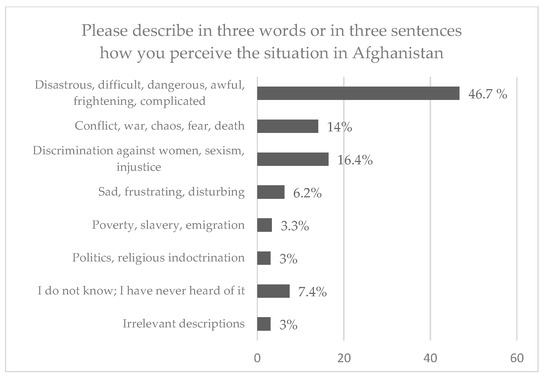 In order to achieve this objective, the answers to a statement and two close-ended questions were considered. The statement used in the survey created the framework within which the students could describe the situation in Afghanistan in three words or in three sentences. The statement is based on Jung’s word association test [40], and it puts the interlocutor in a difficult situation because it forces him/her to make use of his/her own memory and his/her own knowledge about the topic.