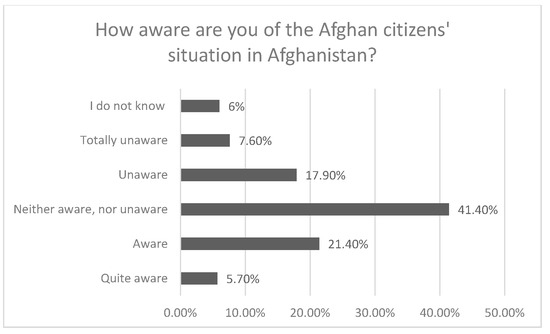 The surveyed Romanian students did not come into contact with Afghan citizens, except for very rare cases, since Afghanistan is a country far away from Romania, and only a few refugees were granted asylum in Romania, even after 2021 [43]. More than half of the interviewees consider themselves aware, to some extent, of the situation in Afghanistan (Figure 4). Therefore, 5.7% of the respondents are quite aware, 21.4% of them are aware and 41.4% are neither aware, nor unaware. There are also participants who consider themselves unaware (17.9%), who are totally unaware (7.6%) and who do not know (6%).