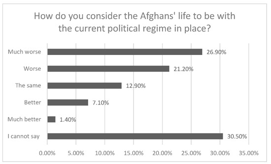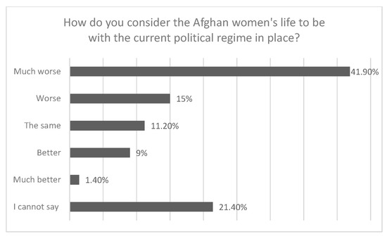 Regarding the perception of women’s lives in Afghanistan after the establishment of the current political regime, the percentages (Figure 7) indicate that more than half of the respondents believe that women suffer greatly due to the new political changes. The data show that 41.9% of the participants believe that women do much worse and 15% believe they do worse. Moreover, 11.2% of the respondents point out that the situation is the same. A category of approximately 10% are confident that women do (much) better while the current political regime is in place (9% better and 1.4% much better). A significant ratio of 21.4% of subjects did not give an answer. In other words, most of the interviewees (56.9%) have an accurate image of the situation of Afghan women under the current political regime [15,16,17,21,22,23], whereas the rest of the surveyees are less informed.