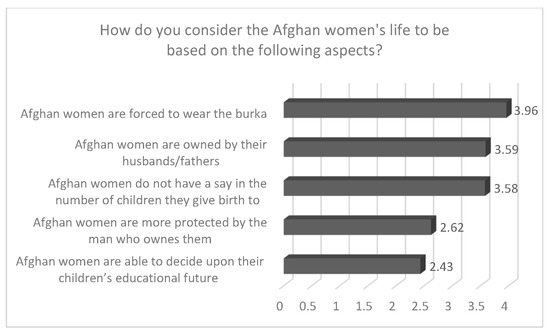 For this question, the respondents had to express their point of view about the life of Afghan women after the establishment of the current political regime. Knowing that it is a traditional and religious regime [6,16], the statements emphasised these particular aspects. Figure 8 presents the answers on a measurement scale from 1 to 5, where 1 means to a very small extent/not at all and 5 means to a very large extent. Two categories of answers can be distinguished, i.e., the highest, as average statistics, relative to the middle of the scale, namely 3, and the lowest, relative to the same middle of the scale. In the first category, the following answers were recorded: Afghan women are forced to wear the burka—3.96%; Afghan women are owned by their husbands/fathers—3.59%; Afghan women are able to decide upon their children’s educational future—3.58%. In other words, the most personal things in a woman’s life no longer belong to her. She can no longer have a public visual identity through her face. She has no rights since she is owned by her father or husband, and worse, she cannot decide on the matter of motherhood, i.e., on the number of children to give birth to. The second category of answers encompasses the following aspects, which scored averages below the middle of the scale, e.g., Afghan women are more protected by the man who owns them—2.62%; Afghan women are able to decide upon their children’s educational future—2.43%. The percentage (2.62%) shows the respondents’ mistrust of the protection received by women from their men. Also, women are not able to decide much about their children’s educational future. Therefore, the respondents consider that women’s lives have not improved with the current political regime in Afghanistan.