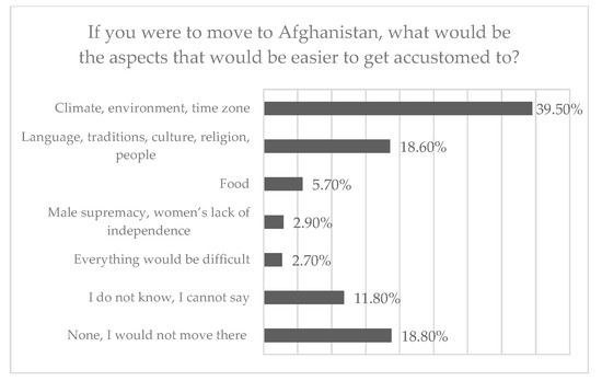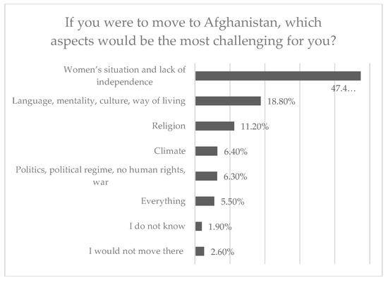 The first question regarding a hypothetical move to Afghanistan made the respondents think about facing such a difficult situation (Figure 9). A very small percentage of them refused to perform this hypothetical exercise and answered I would not move there—2.6% or I do not know—1.9%. The other respondents dared to perform this exercise and imagine the challenges that would be in store for them. Therefore, the most challenging aspect for the interviewees is women’s situation and lack of independence—47.4%. In what follows, language, mentality, culture, way of living—18.8%; religion—11.2%; climate—6.4%; politics, political regime, no human rights, war—6.3% rank second, third, fourth and fifth. On the extreme side, there are the participants believing that everything (5.5%) would be extremely challenging with such a move.
