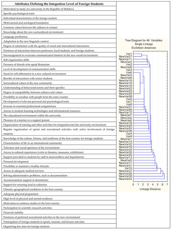 Another significant cluster is associated with “educational support and access to modern learning resources”, defined at approximately “1.5”. This includes indicators such as “presence of a mentor or support person”, “access to technology and educational resources”, and “support offered by academic staff”. These aspects are perceived as essential for academic integration and the educational progress of foreign students. Additionally, the variables “participation in recreational, sports, and tourist activities” are grouped into a distinct cluster, formed at approximately “2”. This grouping suggests that student involvement in extracurricular activities contributes to creating a sense of belonging and facilitates social integration.