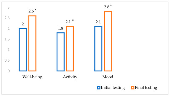 Figure 3, the average values for the three scales (well-being, activity, mood) are shown, both at the initial and final stages.