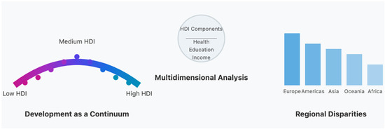Graphical abstract illustrating the key concepts of development continuums. The visualization represents the Human Development Index (HDI) as a continuous spectrum rather than discrete categories, showing how countries progress along a development continuum. The central element highlights the multidimensional nature of HDI (health, education, income) that forms the basis of our analysis, while the right section demonstrates regional disparities in development levels. Our findings reveal the emergence of “development neighborhoods”—clusters of countries with similar development characteristics that often transcend geographical boundaries—and challenge traditional binary classifications of global development.