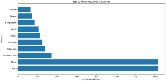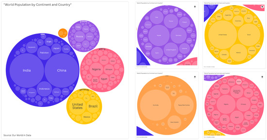 Interactive circle packing visualization of global population distribution in 2023. Countries are grouped by continent, with circle sizes proportional to population. The hierarchical layout reveals both continental and national-level population patterns, highlighting Asia’s demographic dominance led by China and India. Interactive version available at https://public.flourish.studio/visualisation/20110969/ (accessed on 1 January 2025).