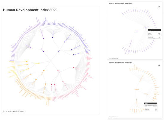 Interactive radial dendrogram visualization of the Human Development Index 2022. The visualization reveals hierarchical clustering of countries based on HDI values, with branches colored by development level (purple for highest HDI to pink for lowest). The radial layout emphasizes the continuous nature of development levels while preserving natural groupings. Interactive version available at https://public.flourish.studio/visualisation/20112689/ (accessed on 1 January 2025).