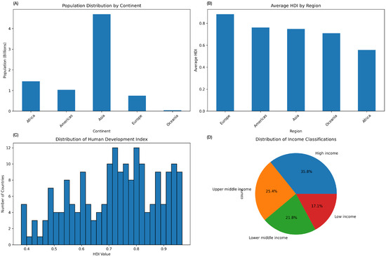 Comprehensive analysis of global population and development patterns. (A) Population distribution by continent showing the total population in billions across major continental regions. (B) Average HDI by region displaying mean Human Development Index values across geographical regions, highlighting development disparities. (C) Distribution of Human Development Index values across all countries, revealing the global development spectrum. (D) Distribution of income classifications showing the proportion of countries in different income categories based on HDI thresholds.