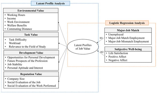 This study employs LPA to identify the latent profiles of job value among culinary arts graduates. Subsequently, logistic regression analysis examines how major–job match status (unemployed, major–job match employment, major–job mismatch employment) and subjective well-being (life satisfaction, positive affect, negative affect) influence these latent profiles. The research model is presented in Figure 1.
