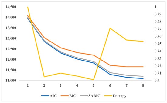 Curves of AIC, BIC, SABIC, and entropy by number of profiles. Note: author’s own work, based on the model fit indices in Table 3.
