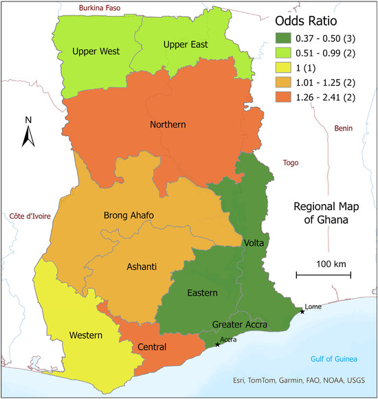 Based on the map (see, Figure 2), the Western region served as the reference point. When the Western region was compared with the Volta region, women in the Volta region (OR 0.373 [95% CI 0.291–0.477, p < 0.001]) and the Eastern region (OR 0.494 [95% CI 0.41–0.596, p < 0.001]) had the lowest odds of justifying male IPV against women when compared to the Western region. The women in the Northern region (OR 2.411 [95% CI 1.955–2.973, p < 0.001]) and the Central region (OR 1.312 [95% CI 1.101–1.564, p < 0.002]) were more likely to justify male IPV against women than their counterparts in other regions. Their justification value is higher than the national acceptance rate. The Upper East (OR 0.751 [95% CI 0.567–0994, p < 0.045]) and Upper West (OR 0.941 [95% CI 0.698–1.27, p < 0.692]) regions were less likely to accept male IPV against women, respectively, although their justification value is close to the national rate.