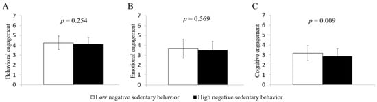 ANCOVA analysis comparing adolescents with low negative sedentary behavior (≤3 h of daily recreational screen time) vs. high negative sedentary behavior (>3 h of daily recreational screen time) in relation to (A) behavioral engagement, (B) emotional engagement, and (C) cognitive engagement.