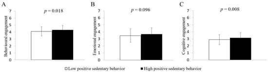 The ANCOVA results highlighting the differences between low and high positive sedentary behavior in relation to behavioral, emotional, and cognitive engagement are shown in Figure 2. The findings revealed that adolescents with high positive sedentary behavior exhibited significantly higher behavioral engagement (4.28 ± 0.65 vs. 4.10 ± 0.66 a.u.; p = 0.018) and cognitive engagement (3.15 ± 0.74 vs. 2.89 ± 0.70 a.u.; p = 0.008) than those with low positive sedentary behavior. However, no significant differences were found between the groups in emotional engagement (3.68 ± 0.91 vs. 3.48 ± 0.98 a.u.; p = 0.096).