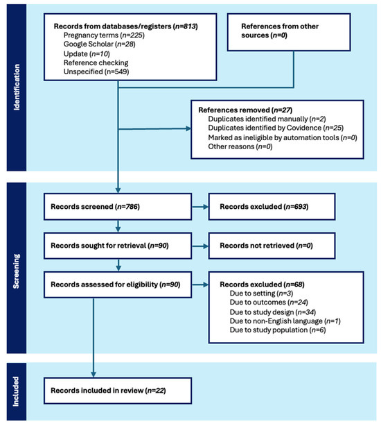 The PRISMA flowchart is presented in Figure 1 and summarises the results of the searches (further details are provided in the Supplementary Materials, Tables S1–S5). In total, 786 unique records were screened for relevance, with 90 checked at full-text stage and 22 meeting the study’s inclusion criteria. Of these 22 papers, 19 were based on unique data sets.