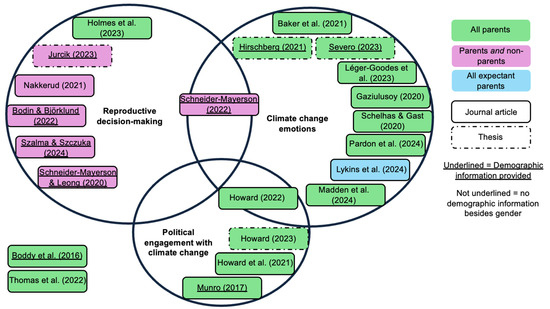 The majority of studies were concerned with (i) reproductive decision-making in the context of climate change and (ii) parents’ perceptions of the emotional impacts of climate change on them and their children. A smaller set of studies (iii) interrogated narratives and practices relating to the experience of parenting in the context of a changing climate. Figure 2 summarises the spread of papers across these foci. As it indicates, two studies did not fit within the three clusters: Thomas et al. [52] explored the alignment of parental and child perspectives as part of a study of children’s views of climate change, and Boddy et al. [32] investigated the role of environmental concerns within moral narratives of responsibility in families in England and India.