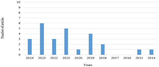 With respect to the year of publication, during the 2014 to 2024 period, it can be observed that the 2019–2024 period had the highest scientific production on the subject under study, with a total of 22 published articles (see Figure 2). In this sense, although the growth was variable and fluctuated over time, the year 2023 is notable (N = 6), followed by 2021 (N = 5), and 2019 (N = 4). In this sense, it can be observed that there is a growing interest in this area among researchers.