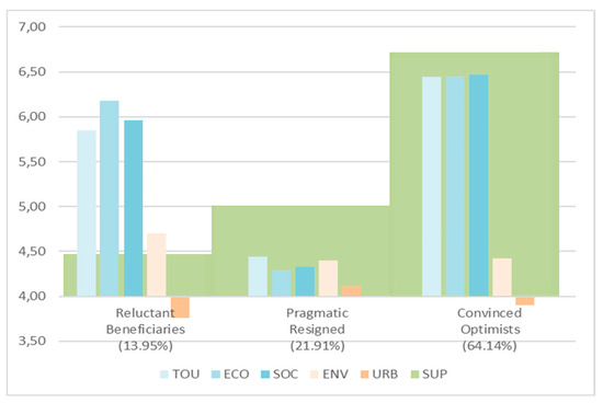 The second cluster has been named “Pragmatic Resigned”. It is made up of 21.91% of the population. Proportionally, this segment has more women than the other two clusters (48.48%), and it is the segment with the highest proportion of people over 51 years of age (16.36%). They give practically the same rating to tourism impact (4.45) and environmental impact (4.43). Below them are the social impact (4.34) and the economic impact as the lowest of all the positive impacts perceived (4.31). The lowest perceived negative impact is urban (4.12) and the dimension with the highest score is support (5.00), being the second most supportive cluster. This is a cluster that finds a moderate balance relatively balanced between positive and negative impacts but still seems to support the celebration of the event by inertia.