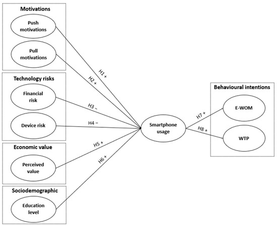 The use of the push–pull theory as a theoretical basis for the present study is justified by its previous application in the tourism field, where it has been used to analyze tourists’ motivations regarding revisit behaviour at a destination [19], satisfaction [22] or recommendation to others [52]. At the same time, this theory has proven useful in technology contexts, assessing how it influences people’s behaviours [18] or e-commerce [53]. Therefore, its application is considered appropriate given the prominent role of technologies in tourism destinations through the use of smartphones and the importance attributed by tourists to the economic value of the services offered. Consequently, this research seeks to explore these intentions in conjunction with key variables such as technological risk, perceived value, E-WOM and WTP. This approach aims to provide a holistic view of the factors influencing tourists’ behaviour, considering the relationship between intrinsic and extrinsic motivations, perceptions of value and technological risks on smartphone usage in the destination and, finally, on E-WOM and WTP behavioural intentions.