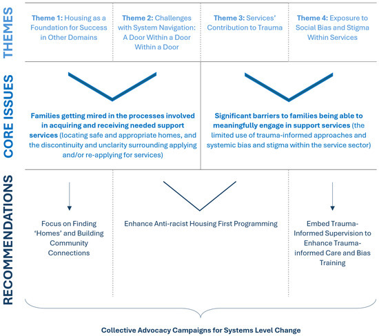 The present study uniquely integrates the lived experiences of staff working in homeless support services and the families they serve. Our results indicate that current system-level limitations constrain service provider’s abilities to support families living in homelessness and that these families are feeling the effects of these service provision issues through social bias and stigma, system navigation difficulties, and re-traumatization when accessing support. In the present study, affordable and sustainable housing was an unmet need that impaired families’ safety and stability, but to meet this need and truly build a sense of “home”, families require choice in their housing options. Unsurprisingly, in the pursuit of acquiring housing, families in the present study were required to navigate multiple systems to meet the varying needs of both themselves and their children, which is consistent with previous studies in the literature [6,7]. A troubling finding of the present study was that these families were confronted with stigma, judgmental treatment, a lack of empathy, and blatant racism; consequently, families’ experiences while homeless were often traumatizing, not just because they were homeless but because the support systems in place to help them caused further harm. Though collaborating with our community partner, we synthesized our themes into two core issues regarding the current state of service provision for families experiencing homelessness: (1) families are being mired in the processes involved in acquiring and receiving the support services needed (locating safe and appropriate homes, and discontinuity and unclarity surrounding applying and/or re-applying for services) (Theme 1 and Theme 2), and (2) there are significant barriers to families being able to meaningfully engage in support services (the limited used of trauma-informed approaches and systemic bias and stigma within the service sector) (Theme 3 and Theme 4). These barriers create and maintain a sense of hopelessness and continued dependence predicated by the stigma of being in need. In the present study, this stigma seemed to be further compounded by dependency stereotypes placed on, and sometimes internalized by, parents. When living situations become untenable, shame over feeling as though they cannot provide for their children can prevent parents from accessing support [8] and feeling like a burden [5].
