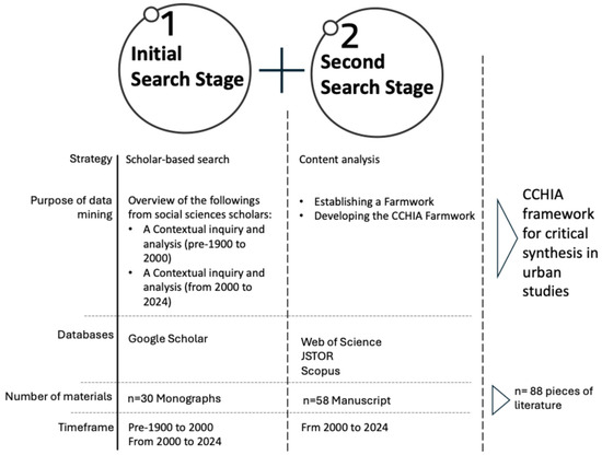 This study employed a two-fold literature search strategy, consisting of an initial search stage of a scholar-based search strategy followed by content analysis (Figure 1). A scholar-based search strategy focuses on identifying the key contributions of influential scholars in the field to establish a foundational understanding of the topic. Content analysis is a qualitative research method used here to interpret textual data by categorizing patterns, themes, and meanings within scholarly works. This strategy aimed to develop a framework integrating historical contextual analyses from the social sciences into the writing of critical syntheses in urban studies.