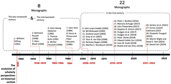 The timeline of the selected 30 seminal monographs on historical context (1883–2024). The text in red represents the selected timeframe for investigation in this study. Source: the authors based on literature [13,19,21,22,25,26,27,28,29,32,41,42,43,51,53,56,57,58,59,60,61,62,63,64,65,66,67,68,69].