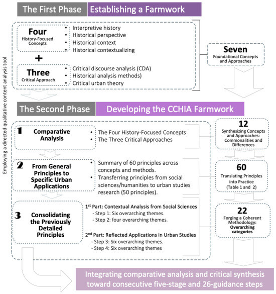 This section outlines the iterative three-stage process behind developing the Contextual Critical Historical Inquiry and Analysis (CCHIA) framework—a tool designed to bridge historical scholarship and contemporary urban practice through contextually grounded research. In the first stage, the CCHIA synthesizes the shared foundations and divergences among four history-focused concepts and three critical approaches, identifying synergies and tensions in their theoretical underpinnings. The second stage transitions from abstract principles to actionable methodologies, exploring how broad perspectives from history and philosophy—such as hermeneutics, power dynamics, and epistemological shifts—can be translated into concrete architectural, urban planning, and design strategies. Finally, the CCHIA framework combines the previously discussed principles into a coherent methodology for addressing complex urban challenges. Connecting historical context with urban design ensures analytical rigor and contextual sensitivity across architectural, urban planning, and urban design research.