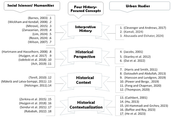 Figure 4. Thirty-five sources for the four history-focused concepts are based on social sciences and urban studies research. Source: the authors based on literature [3,30,31,32,33,50,73,74,75,76,77,78,79,80].